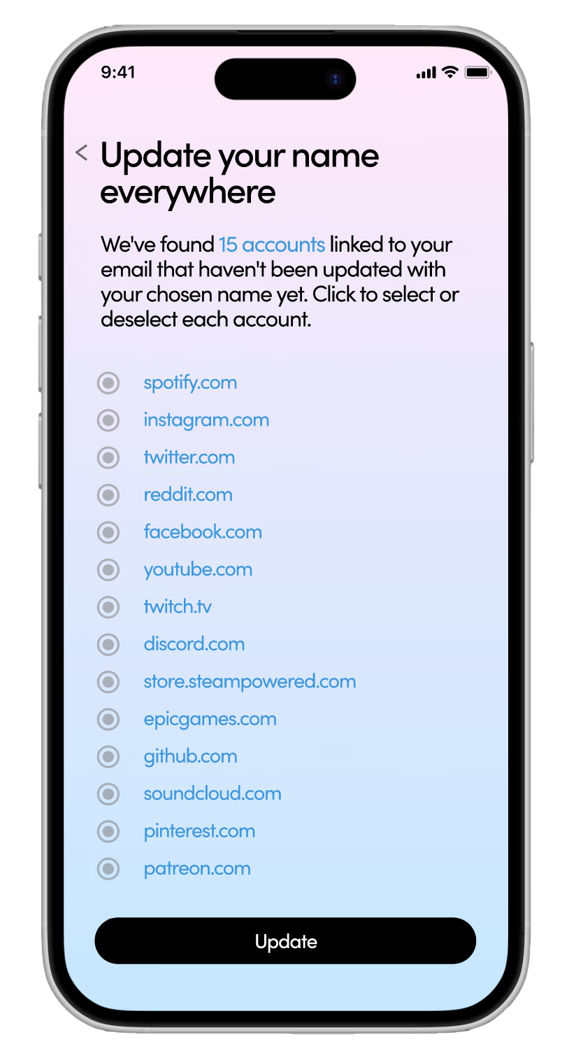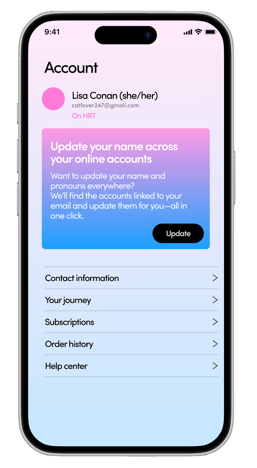 Support Beyond Healthcare. Updating your name online is an important step in a trans person’s journey, but it can be tedious and time-consuming. We make it easy by finding accounts linked to your email that haven’t been updated and changing them to your chosen name—all with one click.